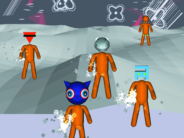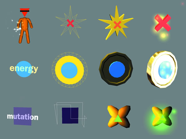 | The environment also employs the narrative structure of video and computer games, with rules and goals determining the gameplay: "The goal of the game is to collect enough [ICON] energy points to create a significant shift in the graphical representation of the world. This is a semiomorph. During play you may shift your mode of representation, which will change the rules of play. You must avoid opposing entities and [ICON] blast icons. The relationships within the world can change suddenly through activation of [ICON] power-ups and [ICON] muticons." |